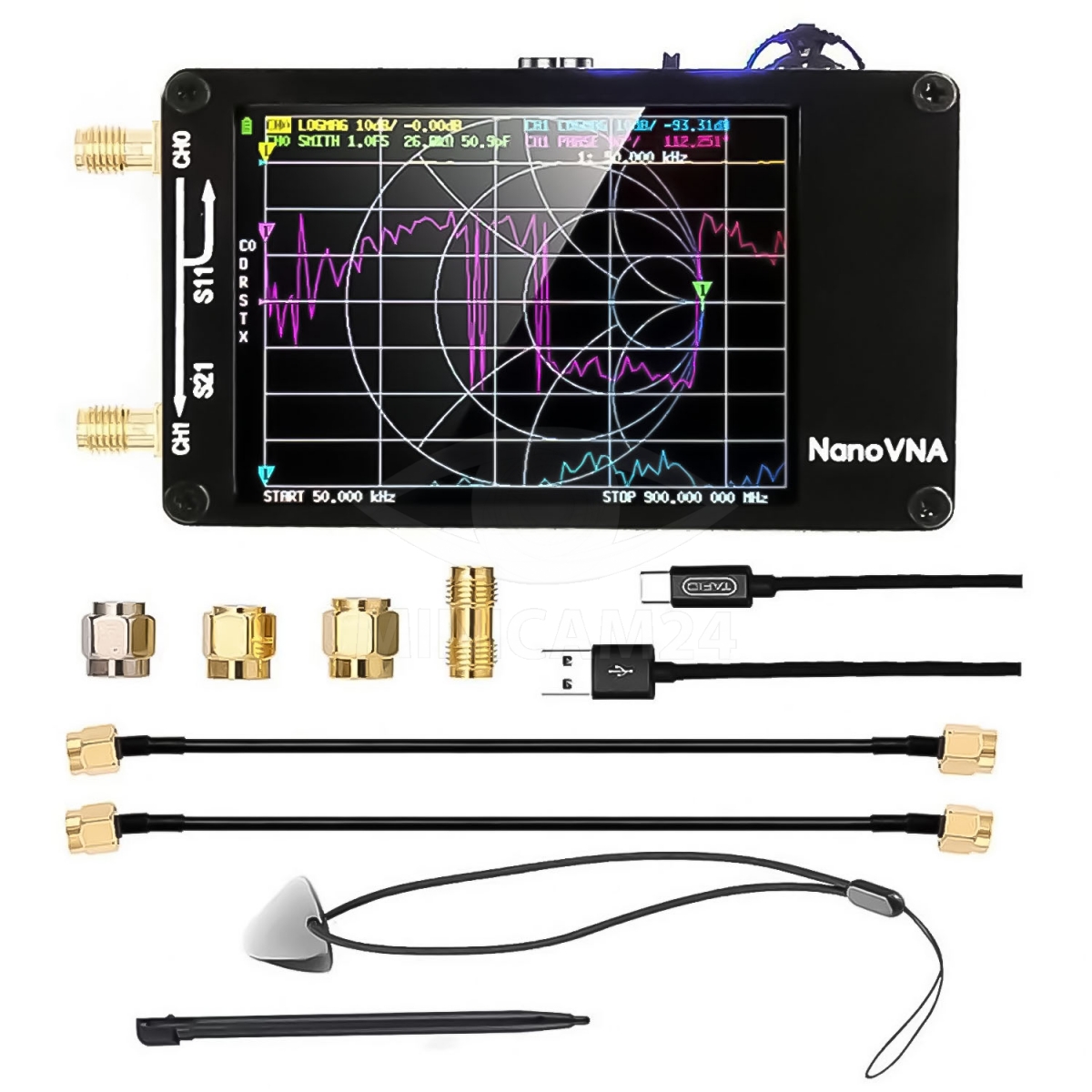 Этот современный прибор работает в широкой полосе частот (от 50 кГц до 1.5 ГГц), предназначен для тестирования и настройки резонансных цепей и радиочастотных трактов различного назначения (аттенюаторы, фильтры, усилители, согласующие устройства и др.). Также может использоваться для настройки антенн, полосовых фильтров, резонаторов различных типов и диапазонов. Конструкция имеет прочный корпус, встроенный аккумулятор большой ёмкости и большой сенсорный дисплей. Для зарядки встроенного аккумулятора и для работы с компьютером используется USB порт. Для защиты sma-разъемов анализатора, при настройке наружных КВ и УКВ антенн, применяется гибкий переходной коаксиальный кабель с переходными антенными адаптерами. Изготовлен из качественного материала, практичный, имеет долгий срок службы. Портативный и компактный, простой в использовании и переноске.